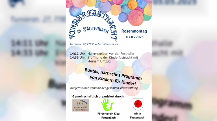 Ein kleiner Umzug führt die junge und alte Narrenschar in die Festhalle, wo ein buntes Programm von Kindern für Kinder auf Sie wartet. Die Jugendabteilungen aus Fautenbach und den umliegenden Vereinen haben spannende und kreative Beiträge vorbereitet. Außerdem sorgen die Organisatoren mit weiteren unterhaltsamen Programmpunkten für jede Menge Spaß und gute Laune.